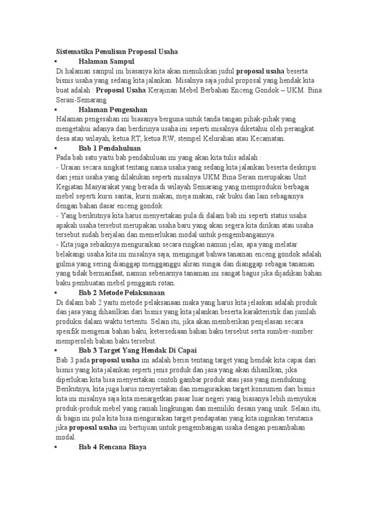 Daftar isi yang memuat sistematika proposal usaha. Contoh proposal usaha atau proposal bisnis di bidang kuliner, jasa, produk, dll✓ lengkap dengan perhitungan dan analisisnya agar lolos dan. Oleh karena itu, sistematika penulisan proposal usaha ini hanya berlaku untuk. Sistematika penulisan proposal usaha sistematika penulisan proposal usaha â·. Kita bisa menyertakan contoh gambar produk atau jasa yang mendukung.